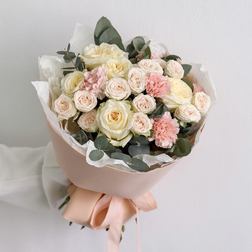 Эвкалипт - 1 шт. Роза - 5 шт. Диантус - 5 шт. роза кустовая софия - 3 шт.